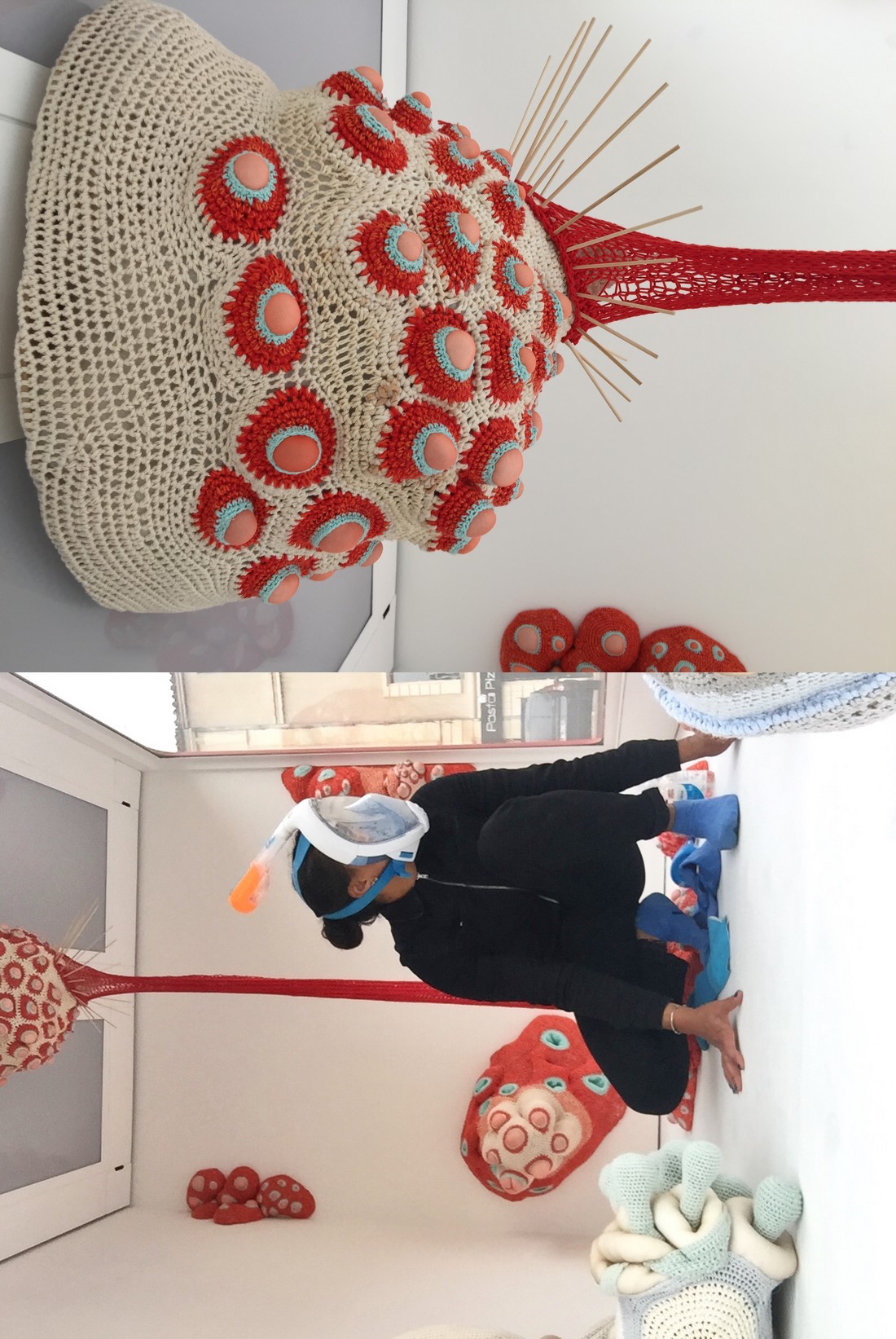 - l’exposition Gossipium d'Ema Eygreteau qui se retrouve confinée dehors dans la galerie TINBOX Mobile sur une place de Bordeaux. Gossipium 4.0 réunissait une série de sculptures textiles aux formes faisant penser à des tumeurs, des nodules, des adhérences qui colonisaient la galerie. J’ai fait 2 performances filmées et un texte au titre deleuzien Devenirs-Mondes et machines de care. Ces deux performances étaient le premier acte pour moi d’une prise de conscience de la nécessité de prendre soin de soi et du récit de soi.
